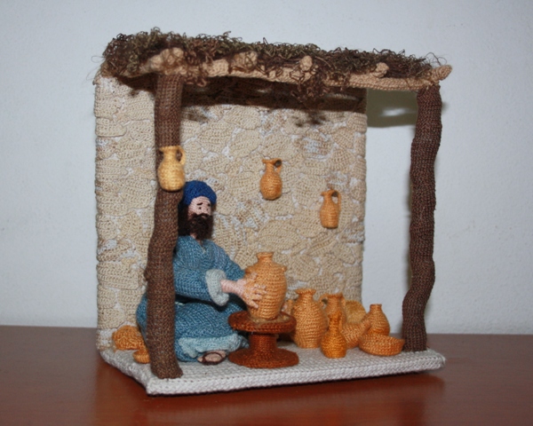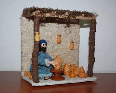 Mais uma peça do presépio, a oficina do oleiro. O oleiro já foi colocado noutra mensagem mais abaixo. Todo este trabalho é feito em crochet. As colunas imitam os troncos de madeira que eram usados na altura como suporte e o telhado, imita o colmo e ramos secos próprios dessa época.