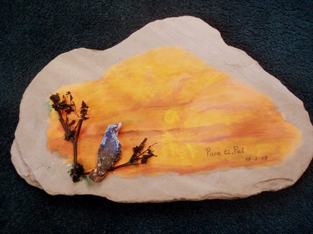 O passarinho foi feito á mão com pequenos pedacinhos de madeira, utilizando um cano de uma planta para o colocar em cima... o resto foi pintado em tons de amarelo e laranja, para realçar o por do sol...