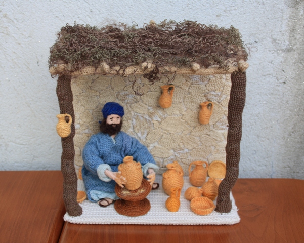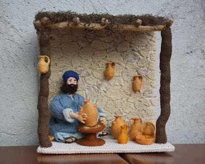 Mais uma peça do presépio, a oficina do oleiro. O oleiro já foi colocado noutra mensagem mais abaixo. Todo este trabalho é feito em crochet. As colunas imitam os troncos de madeira que eram usados na altura como suporte e o telhado, imita o colmo e ramos secos próprios dessa época.